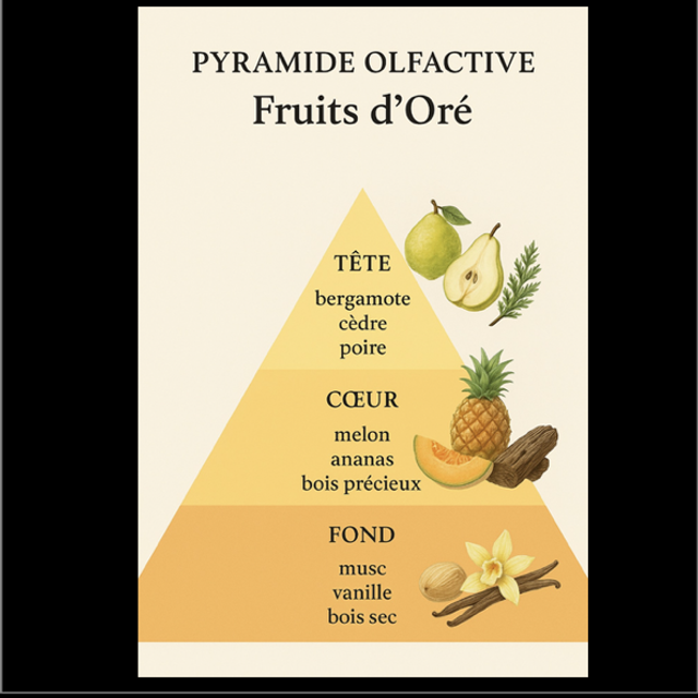 Cette fragrance enveloppante mêle des notes fruitées lumineuses à une base boisée et orientale, créant une atmosphère douce, solaire et raffinée.